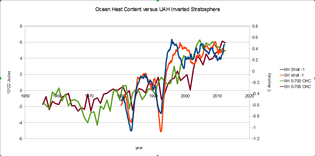 Since the world's oceans are the black body source and the Stratosphere is near the effective gray body "shell" it only make sense that the Stratospheric temperatures would make a good proxy for ocean heat content. The Stratospheric temperature change is inversely proportional though, so in the chart above i have inverted the 25 month moving average of the UAH NH and SH Ocean stratospheric temperature series. The 0-700 meters ocean heat content (OHC) in 10^22 Joule units is from NOAA National Oceanographic Data Center. I just tweaked the Open Office scaling a touch to over lay the two sets of data. The fit is not perfect, then the OHC data is pieced together for most of the time period.